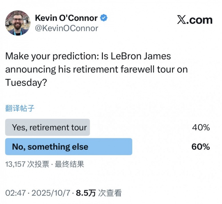 Sau khi James phát hành video trailer về "quyết định thứ hai" ngày hôm qua, phóng viên NBA Kevin O \ 'Connor đã công bố một cuộc khảo sát dự đoán cho cư dân mạng trên phương tiện truyền thông xã hội X: "Xin hãy dự đoán: James sẽ thông báo vào thứ ba rằng anh ấy sẽ đi tham quan đã nghỉ hưu?