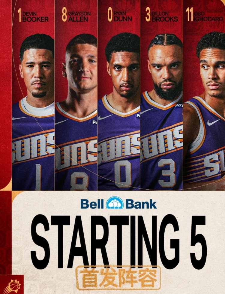 Đội hình xuất phát của Suns: Booker Grayson Allen, Ryan Dunn, Dillon, Iguodaro.